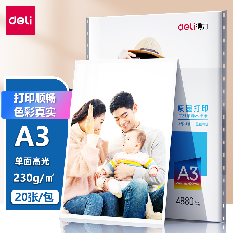 得力11823高光相片纸-A3-230g/㎡(白)(20张/盒)